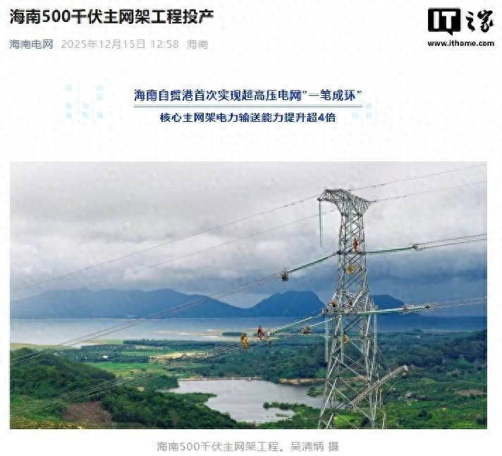 IT之家从官方介绍获悉,该工程新建 500 千伏变电站 3 座,新建输电线路途经海口、三亚、儋州、琼海等 14 个市县,“一笔成环”,形成完整的“口”字型超高压环网架构,标志着海南电网主网架首次实现电压等级从 220 千伏到 500 千伏的历史性跨越,电力输送能力提升超 4 倍。